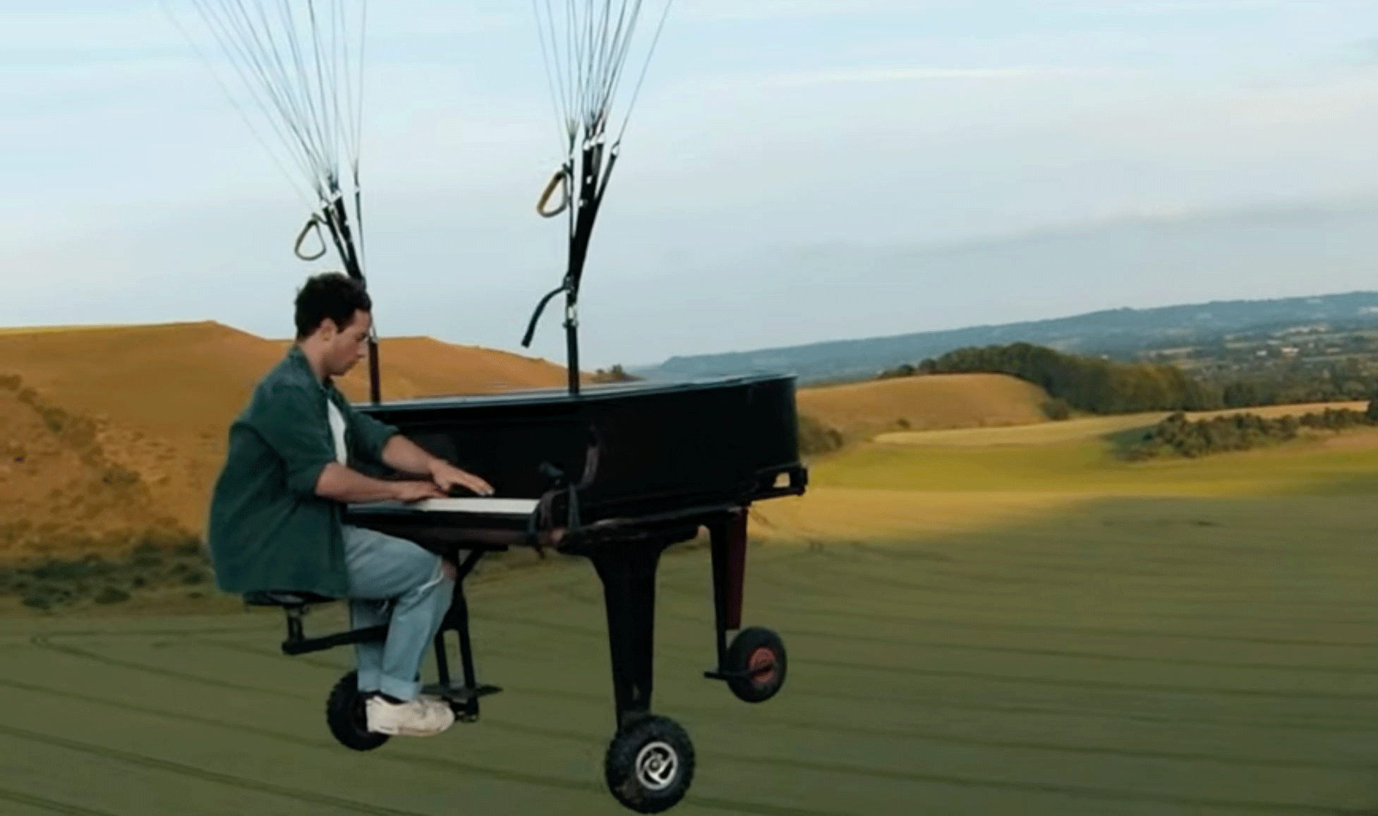 Louis’s family played a major role in bringing the concept to life, helping him engineer the airborne piano and film under challenging weather conditions.