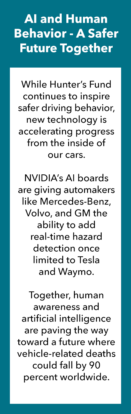 With Hunter’s Fund leading efforts to change driver behavior and AI helping make vehicles safer, we look forward to the day when vehicle-related deaths can be reduced by 90% worldwide.